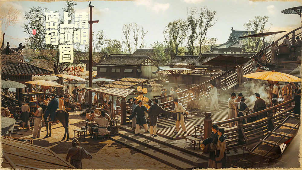 值得一提的是,该剧的拍摄地点位于“周庄数字梦工厂”,由当地政府携手阿里大文娱共同打造。为了能最大程度对《清明上河图》原画作进行复刻,该基地搭建了146亩的宋朝建筑外景,包括21条街道、152处建筑、136棵树、花草灌木3500多株、以及各类动物13种、共计143只。同时,阿里大文娱自研发的虚拟拍摄技术,在剧组设置算法工程师全程跟组,能够保证在摄制现场准确搭建出理想的拍摄场景,阳光、风速、雾气等环境条件都能被精准控制,助力抒情段落的内容表达。“《清明上河图密码》是中国电视剧历史上,第一次完整、准确地还原宋朝建筑群风貌,还原宋朝经济社会生活和市井风情的文化作品。”导演杨帆说。