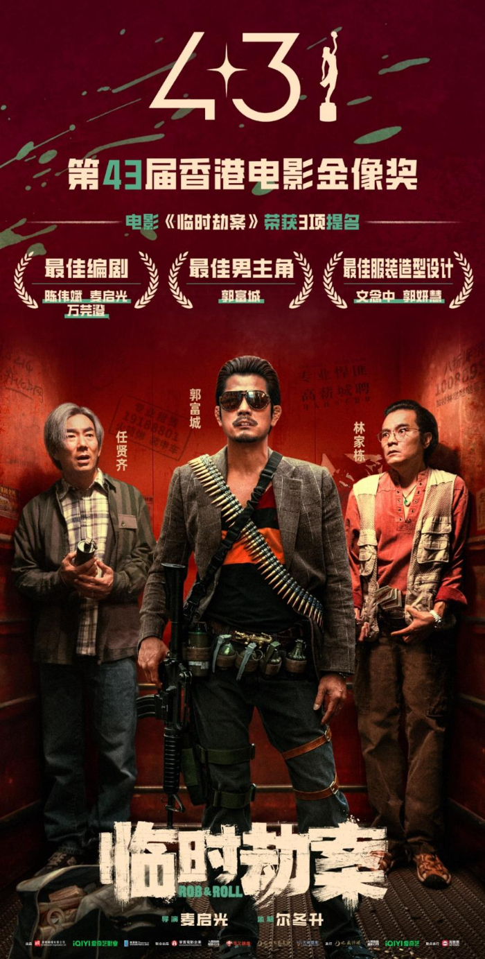 2月14日,第43届中国香港电影金像奖提名名单正式出炉,由爱奇艺出品,尔冬升监制,麦启光执导,郭富城、林家栋、任贤齐、张可颐领衔主演的荒诞喜剧动作电影《临时劫案》,荣获“最佳编剧”“最佳男主角”及“最佳服装造型设计”三项提名。