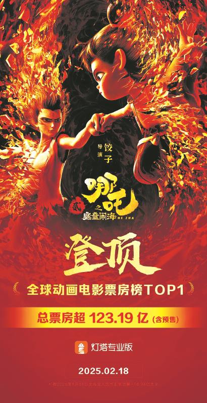 据猫眼专业版数据,截至2月18日19时38分,电影《哪吒之魔童闹海》全球票房(含预售及海外)累计超123.19亿元,超越《头脑特工队2》,登顶全球动画电影票房榜。