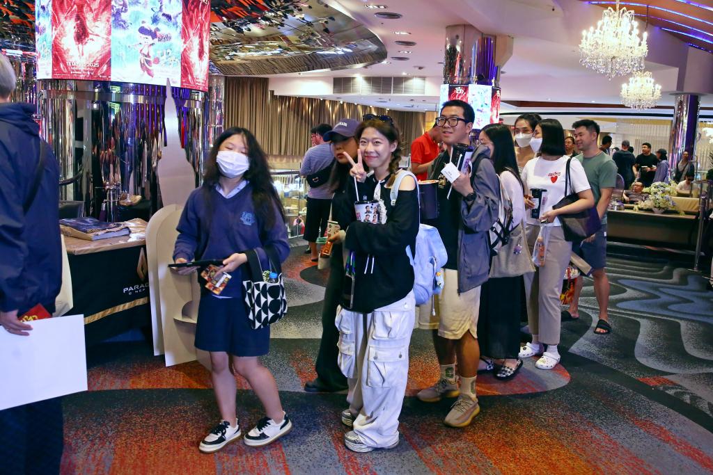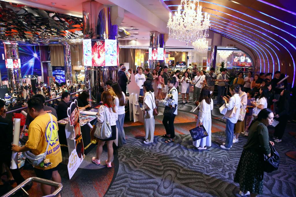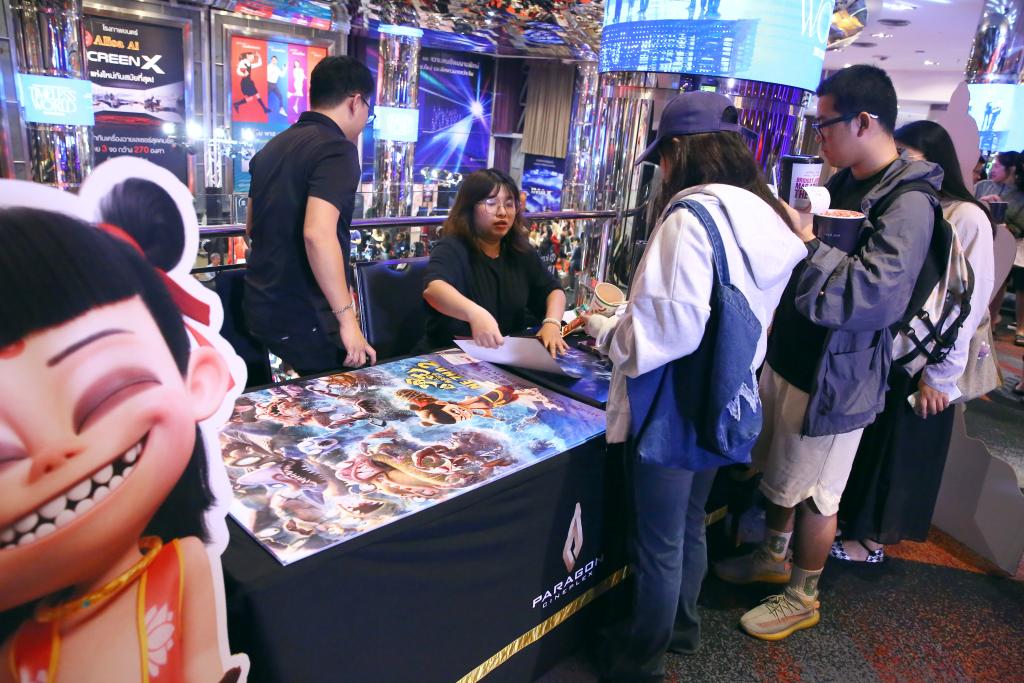 3月12日,在泰国曼谷暹罗百丽宫,参加《哪吒2》首映活动的观众排队领取电影海报。新华社记者 孙玮彤 摄