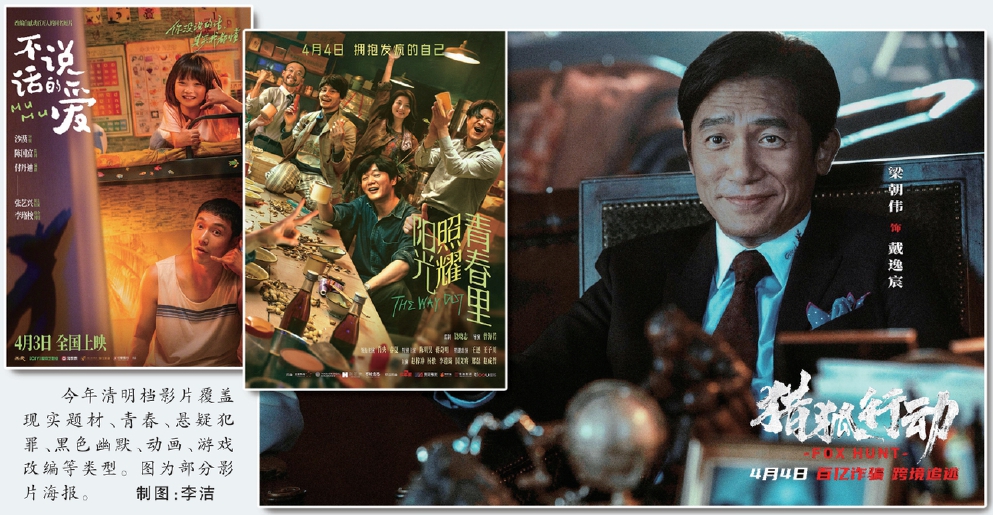 今年清明档影片覆盖现实题材、青春、悬疑犯罪、黑色幽默、动画、游戏改编等类型。图为部分影片海报。 制图:李洁