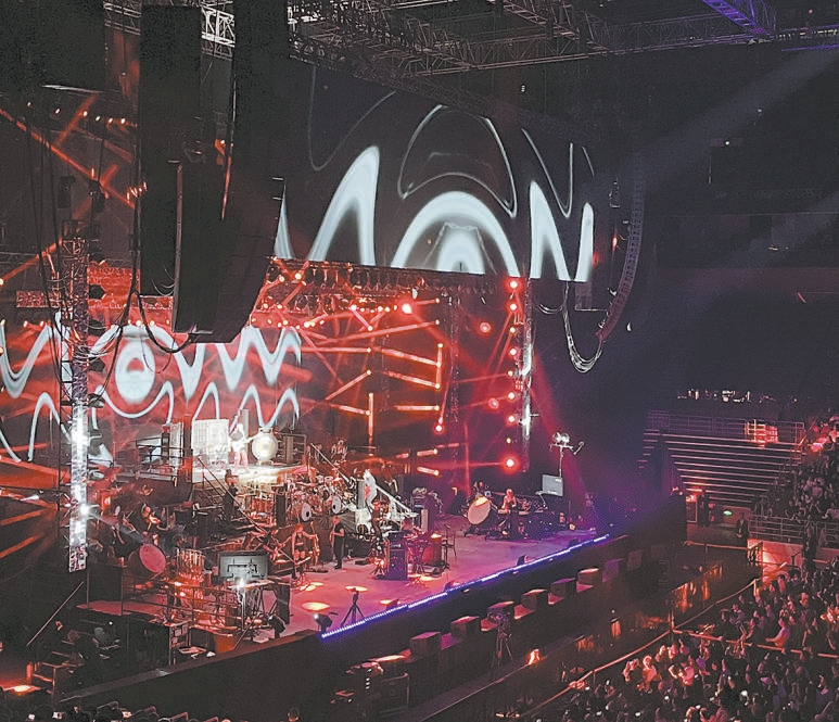 演出当晚,华熙LIVE·五棵松的场馆中万余名观众坐得满满当当,演出还未开始,氛围音乐中的潮水声、电声音乐模拟的宇宙音效已经让人神往,不觉想到汉斯·季默配乐电影中浩瀚的宇宙空间。一声苍凉的琴声拉响,民族风的配乐和舞台屏幕上流动的光斑,一下把观众带入电影《沙丘》的氛围中。屏幕缓慢升起,汉斯·季默与庞大的电声和交响乐团出现在观众面前。尖叫声盖过了音乐声,很快又被更强烈的电声超越,《沙丘》《盗梦空间》等电影的配乐经过重新编配上演,电影《加勒比海盗》的经典配乐闪现时,更是让全场无比振奋,鼓声、贝斯声直冲体育馆穹顶。