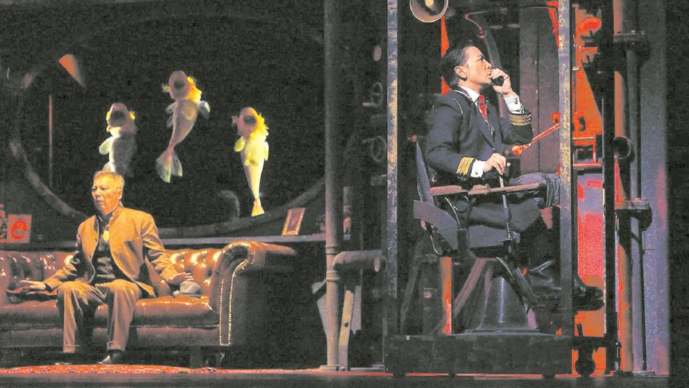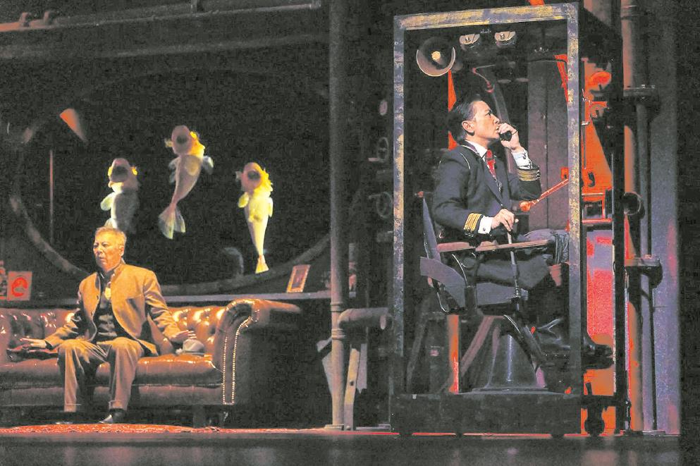 这种现代平等的角色人物关系与古典尊卑的角色人物关系形成了一组强烈的对照,两对经典喜剧组合在全剧中奉献出了跨越古今、超越地域的幽默,喜剧表演里经典的重复技巧被运用到了极致,英夹中的台词中巧妙地融入“奥扫西开”“哪能意思”等上海话,丰富的小丑肢体表演推动剧情发展增加滑稽感。种种喜剧元素的运用使原本厚重的原著自然而然地转变为一场恰到好处的法式轻喜剧,不仅创造出一种全新的关于幽默的体验,让整个剧作在艺术表现上呈现出一种独特的魅力,更为重要的是,这种角色关系的对照巧妙地映射出了尼摩船长与现代社会之间的割裂与背离。