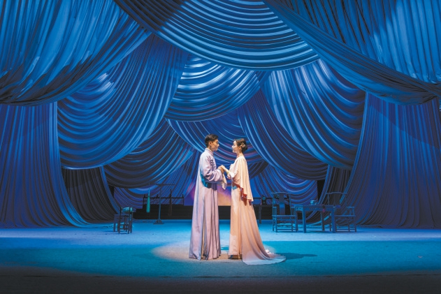 近日,北京人民艺术剧院再次排演该剧,以意象化手段赋予剧中男女主人公的爱情以诗意——不但在两人交谈时加入了许多戏曲身段,更加入了新的台词强化两人的爱慕之情;结尾以一段双人舞展现两个自由的灵魂在虚空中的相会;不时出现的昆曲《牡丹亭》作为背景音乐,昭示两人超越生死的爱恋。