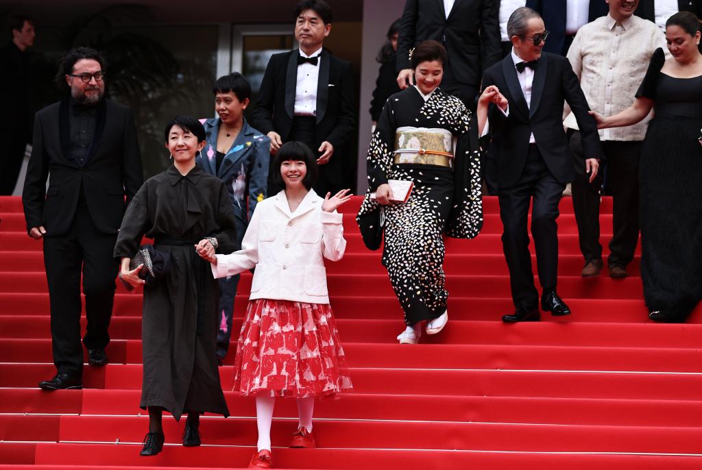 5月17日,在法国戛纳举行的第78届戛纳国际电影节上,主竞赛单元影片《雷诺阿》导演早川千绘(前左)和主演铃木唯(前右)在影片首映后走出电影宫。新华社记者 高静 摄