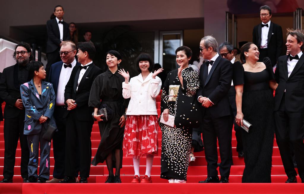5月17日,在法国戛纳举行的第78届戛纳国际电影节上,主竞赛单元影片《雷诺阿》主创人员在影片首映后合影。新华社记者 高静 摄