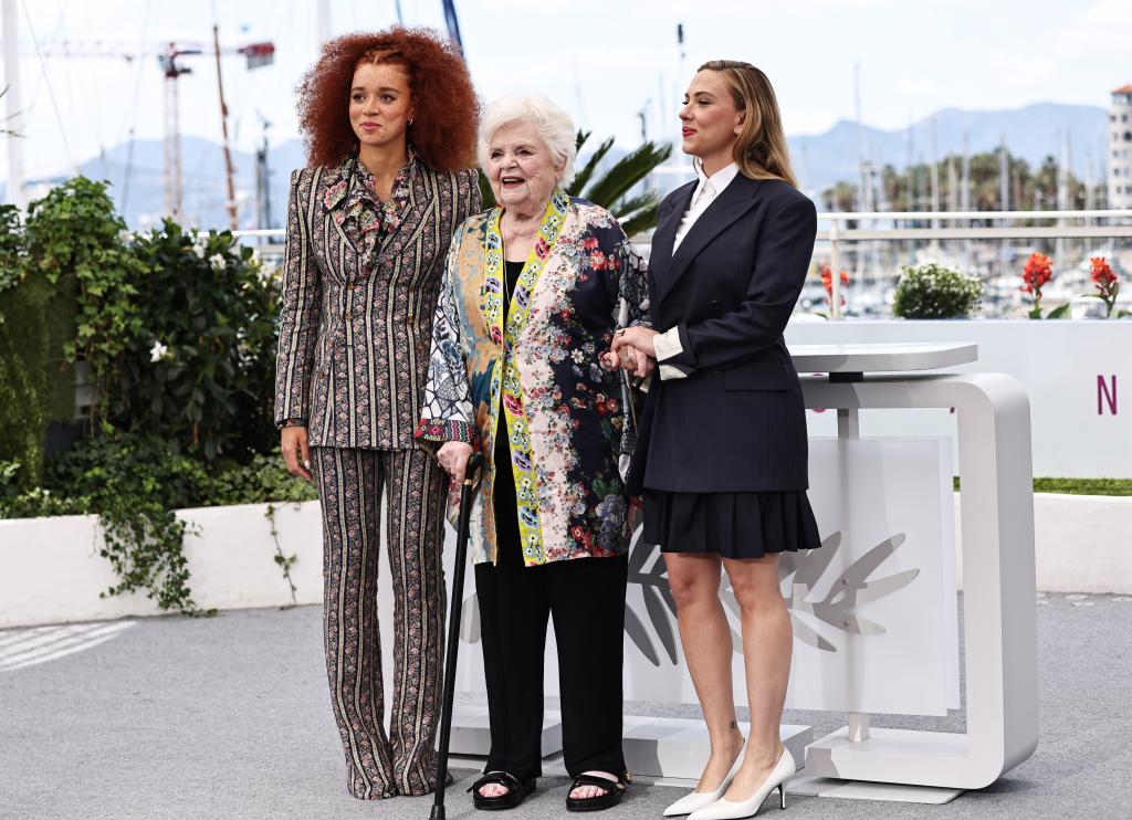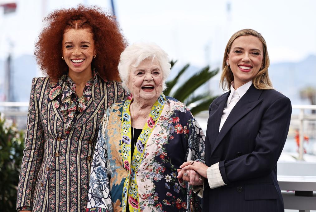 5月21日,在法国南部小城戛纳举行的第78届戛纳国际电影节上,影片《了不起的埃莉诺》导演斯嘉丽·约翰逊(右)携主演朱恩·斯奎布(中)和艾琳·凯利曼亮相拍照式。新华社记者 高静 摄