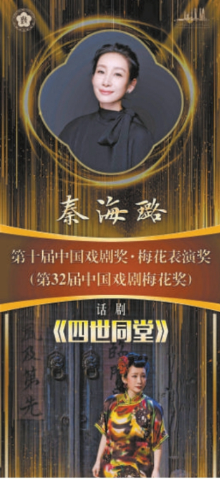 中国国家话剧院演员秦海璐凭借话剧《四世同堂》中“大赤包”一角,荣膺第十届中国戏剧奖·梅花表演奖(第32届中国戏剧梅花奖)。