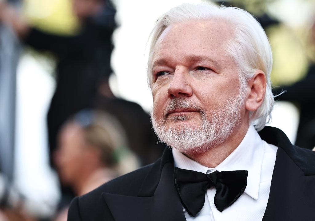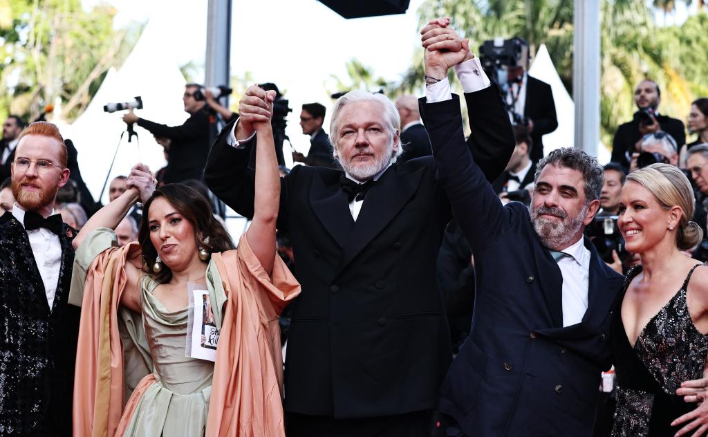 5月21日,在法国南部小城戛纳举行的第78届戛纳国际电影节上,“维基揭秘”网站创始人朱利安·阿桑奇与传记影片《60亿美金先生》的主创出席主竞赛单元影片《时光留声》首映式。新华社记者 高静 摄