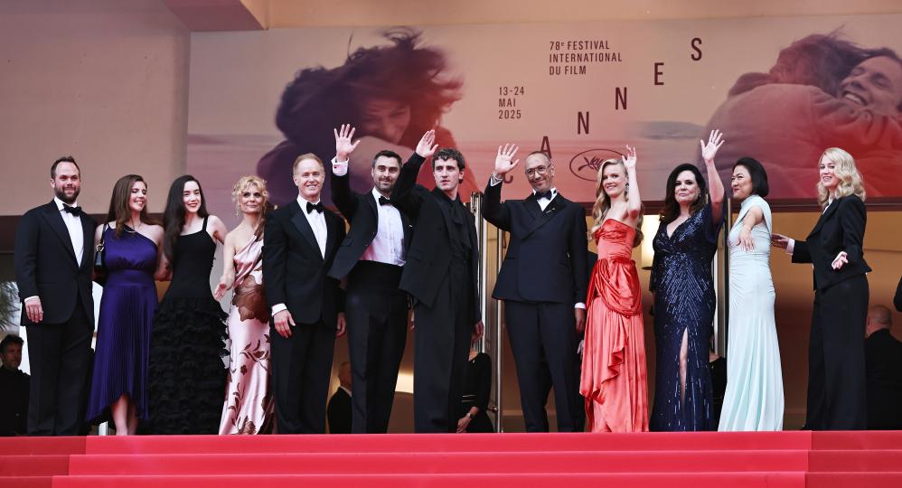5月21日,在法国南部小城戛纳举行的第78届戛纳国际电影节上,主竞赛单元影片《时光留声》的影片主创出席该片首映式。新华社记者 高静 摄