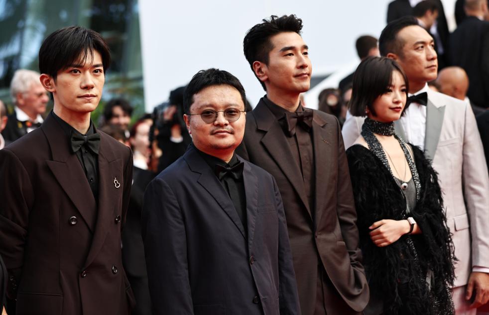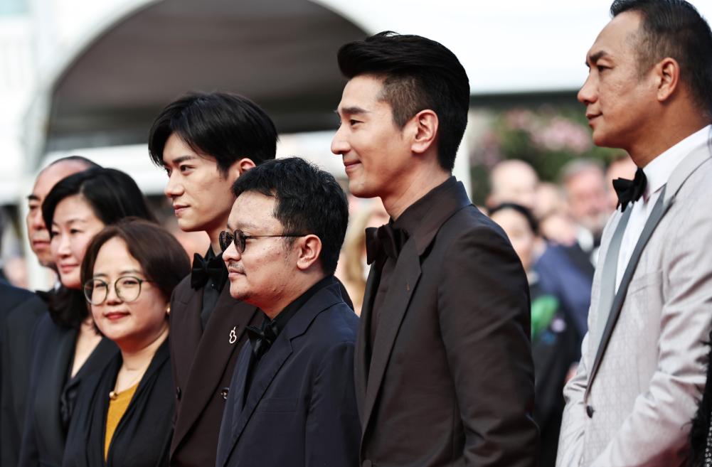 5月24日,在法国南部小城戛纳,中国影片《狂野时代》导演毕赣(右五)携主创人员踏上闭幕式红毯。新华社记者 高静 摄