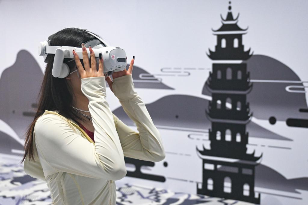 6月14日,观众在电影艺术展上参与VR体验项目。新华社发(陈浩明摄)