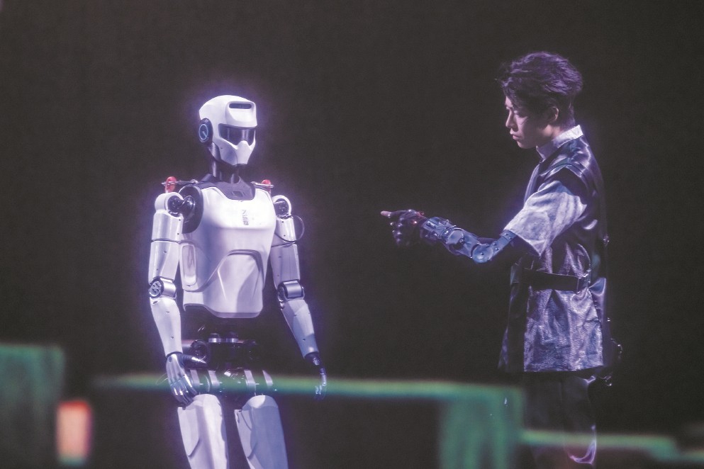 这是发生在中国大戏院长三角城市戏剧节中的最“科幻”一幕,国内领先的机器人走出实验室和展厅,以接地气、亲和的方式来到普通人身边。面对这样的场景,人们不再那么陌生——2025春晚上,张艺谋导演的《秧BOT》让人形机器人略显滑稽地扭起秧歌;上半年,半程马拉松也迎来人形机器人“跌跌撞撞”的身影。“我们在探索一种可能性,试着模拟发生在未来的场景。”《巨物之城》艺术总监、上海戏剧学院艺术科技与管理学院副院长沈倩对记者说,“无论对于机器人还是演艺产业来说,都具有破圈的意义。”诚然,机器人仍在亦步亦趋地努力跟上人类的节奏,但其不断前进的脚步已经令人激动。面对“人机共生”的时代命题,上海迈出了全国舞台实践的第一步。