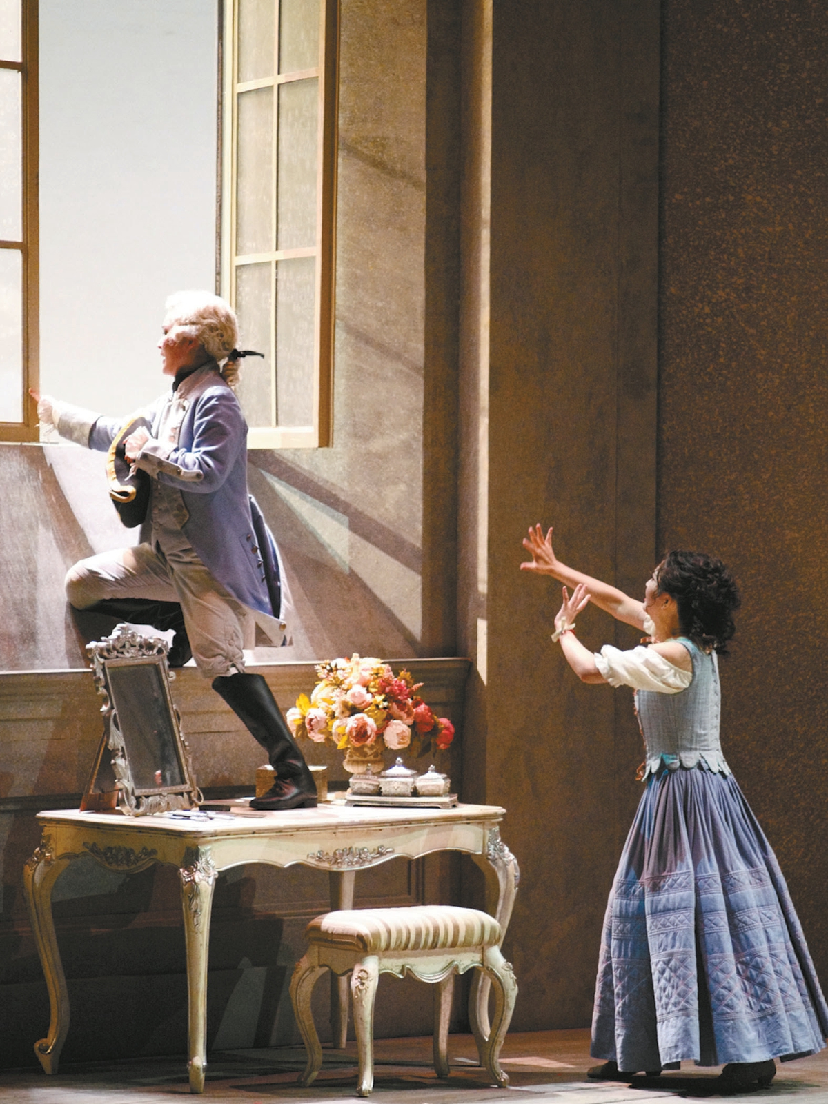 奥地利男中音马库斯·维尔巴饰演的费加罗一登场便赢得满堂喝彩。他以浑厚圆润的音色与精湛的表演技巧,将这位机智勇敢的男仆形象刻画得入木三分。在咏叹调“如果你想跳舞”中,维尔巴与国家大剧院合唱团的默契配合将剧情推向首个高潮,合唱团饱满和谐的和声为音乐增添了绚丽色彩。第一幕结尾处,维尔巴演唱的著名咏叹调“再不要去做情郎”以明快有力的旋律与温柔劝导的宣叙调交替呈现,生动展现了费加罗幽默风趣与坚定勇敢的双重性格,铿锵有力的演唱赢得全场掌声雷动。