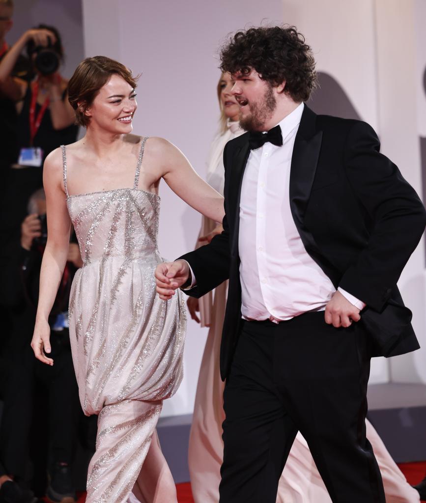 8月28日,在意大利威尼斯,演员艾玛·斯通(左)和艾丹·德尔比思出席电影《拯救地球》首映红毯仪式。新华社记者 李京 摄