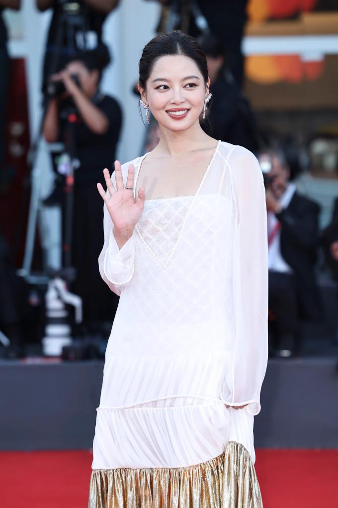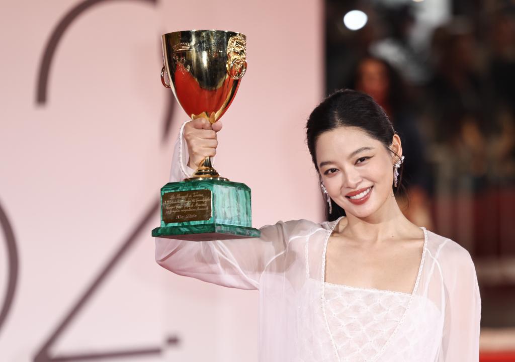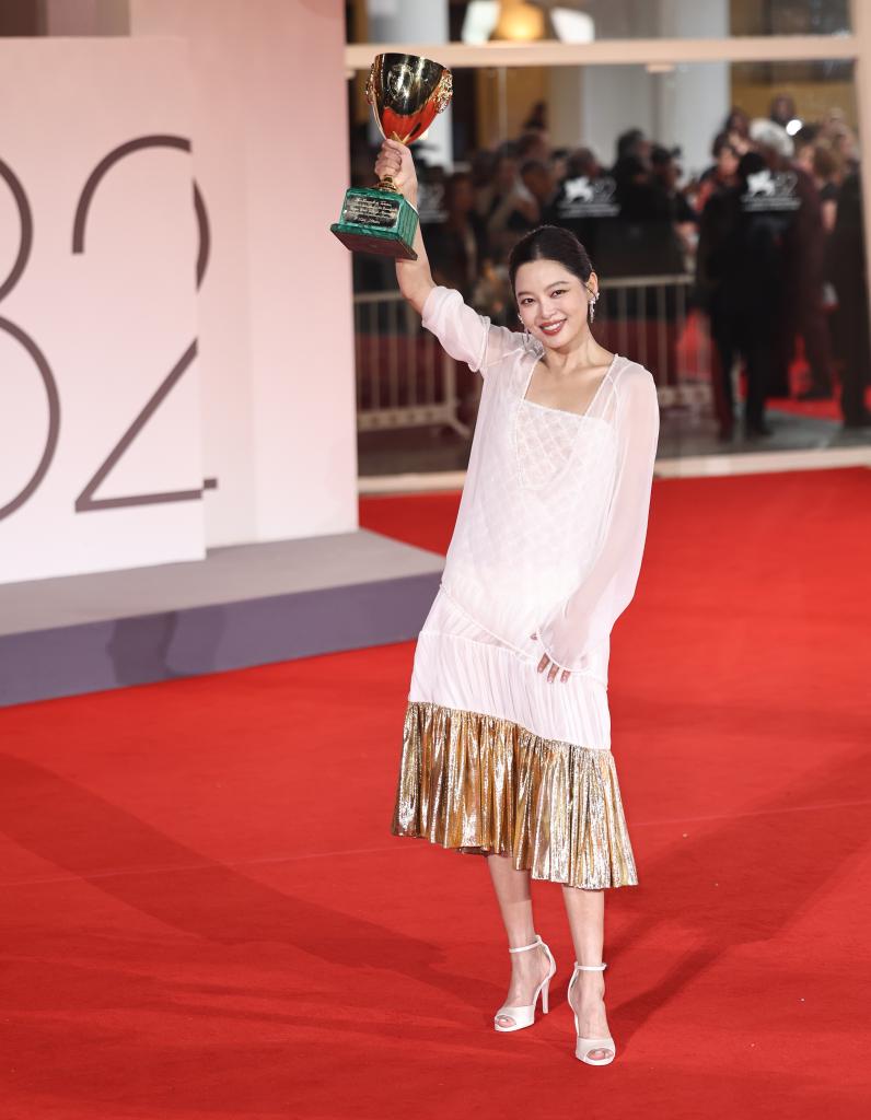 9月6日,在意大利威尼斯,辛芷蕾夺得第82届威尼斯电影节最佳女演员奖。新华社记者 李京 摄