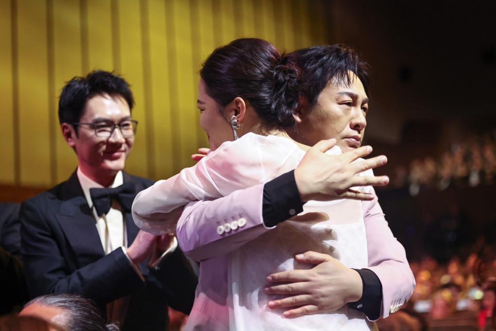 9月6日,在意大利威尼斯,辛芷蕾(右)夺得第82届威尼斯电影节最佳女演员奖后接受电影《日掛中天》演员张颂文和冯绍峰祝贺。新华社记者 李京 摄