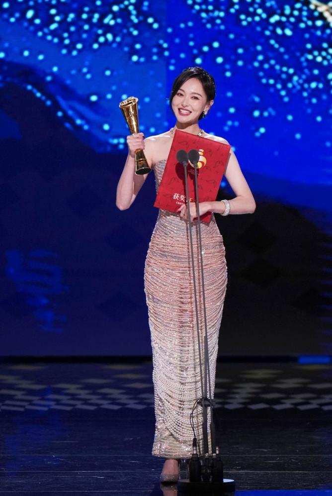 9月13日,在第二届金熊猫盛典上,电视剧单元最佳女主角唐嫣发表获奖感言。新华社记者 江宏景 摄