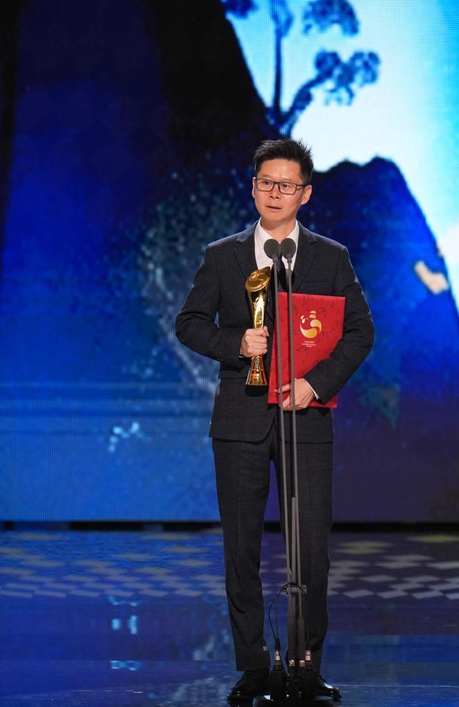 9月13日,在第二届金熊猫盛典上,纪录片单元最佳导演奖得主高松发表获奖感言。新华社记者 江宏景 摄