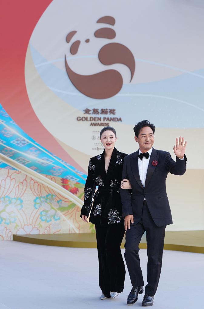 9月13日,演员蒋欣(左)和郭晓东走在第二届金熊猫盛典的“金熊猫大道”上。新华社记者 江宏景 摄