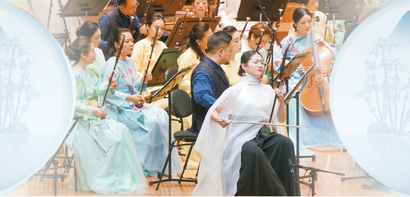 演出由知名华人指挥家汤沐海执棒,来自上海民族乐团的70余位演奏家一同奏响华章。“海上生民乐”分音乐会版和上海音乐厅驻场版,前者偏向西方当代交响音乐会的制式,后者则融入多媒体光影,更倾向于沉浸式音乐现场。因而,曲目会根据现场环境和观众特征做适当调整。国外演出时,会增加二胡与乐队合奏的《卧虎藏龙》(见上图)——这是东西方观众都熟悉,甚至会在眼前浮现出竹林摇曳画面的曲目。音乐会版在编曲上的处理会在尾声处以渐强手法处理中西乐器的合奏共鸣,把情感推向高潮。琵琶、京胡与乐队合奏的《楚汉》中,俞冰的琵琶独奏气势不凡,凸显出西楚霸王的威武。唢呐与乐队合奏《凤舞》时,胡晨韵不仅能吹出一个超乎常人想象的长音,还能与笛子手等一起营造一群鸟儿的生动“对话”,时而平和时而激动,惹得观众忍俊不禁。而改编自脍炙人口的《野蜂飞舞》的民乐重奏《蜂飞》则赋予俄罗斯作曲家里姆斯基-科萨科夫的经典名曲“中华风韵”——眼见着民族乐器在王音睿、赵臻、丁龙等掌控的打击乐、笙和二胡的乐音中展现出妙趣横生的“画面”。而开场,金锴与赵韵梦领衔的竹笛与乐队合奏《湖光》则凸显出江南文化的音乐声色。
