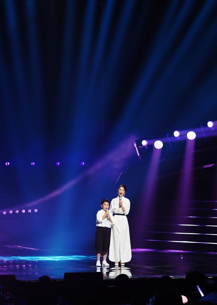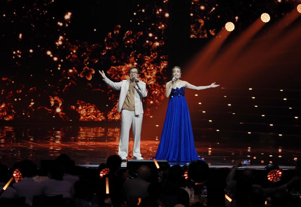 9月28日,王力宏(左)和单依纯在演唱《落叶归根》。新华社发(张金加摄)