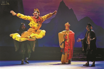 此外,该剧还利用舞台技术突破了传统戏曲的节奏,使之更为紧凑连贯。比如白骨精定下计谋要去侦探唐僧情况时,舞台光暗,一个发光小球飞升直达天幕,暗示白骨精元神飞出洞府,同时伴有类似影视音效作为烘托;而在唐僧狠心驱逐孙悟空时,孙悟空向八戒沙僧交代完后,从上场门下场,后场马上就安排一个孙悟空替身吊威亚从上场口飞到下场口,过程连贯自然,这都是受到电影艺术启发的创新。