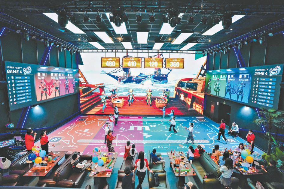 主屏幕、左右侧屏和天幕组成的四块大屏变幻出绚丽光影,影厅变成了欢乐喧闹的派对现场。场地中央的观众集结组队,在游戏世界中展开钓鱼、夺宝、打冰球等激烈对抗。观众席上的人也没闲着,边吃零食边围观点评大屏上队友的表现。位于耀莱成龙影城五棵松店的Mirra奇镜派对融合厅,是全国首家巨幕沉浸影游空间。