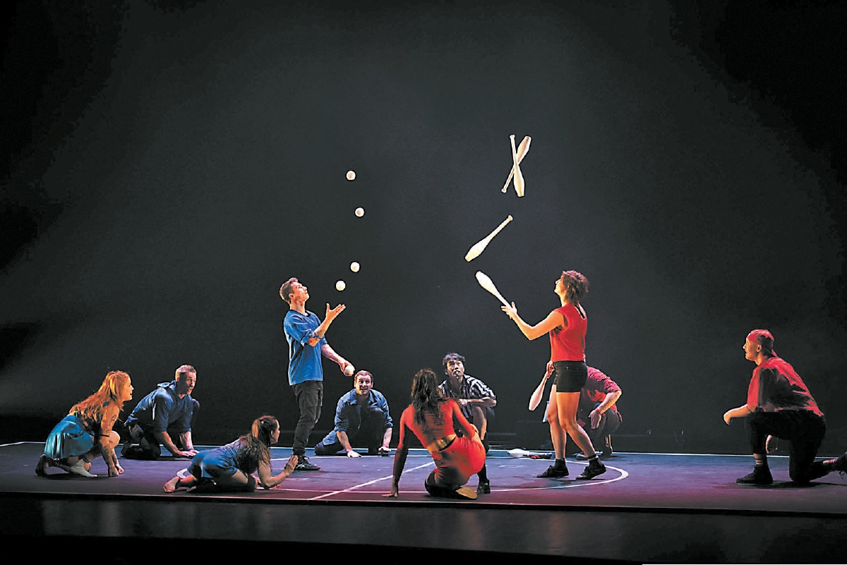 而来自加拿大魁北克的七指杂技团带来的《决斗》,则向莎翁名剧《罗密欧与朱丽叶》取经。篮球场上红蓝大战,扯铃抛球、杂耍竿技、摇摇板呼啦圈,各怀绝技出奇谋;表演者翻滚跳跃,悬空倒吊,叫人捏一把冷汗,是比音乐剧《西区故事》更名副其实的“情场如战场”。