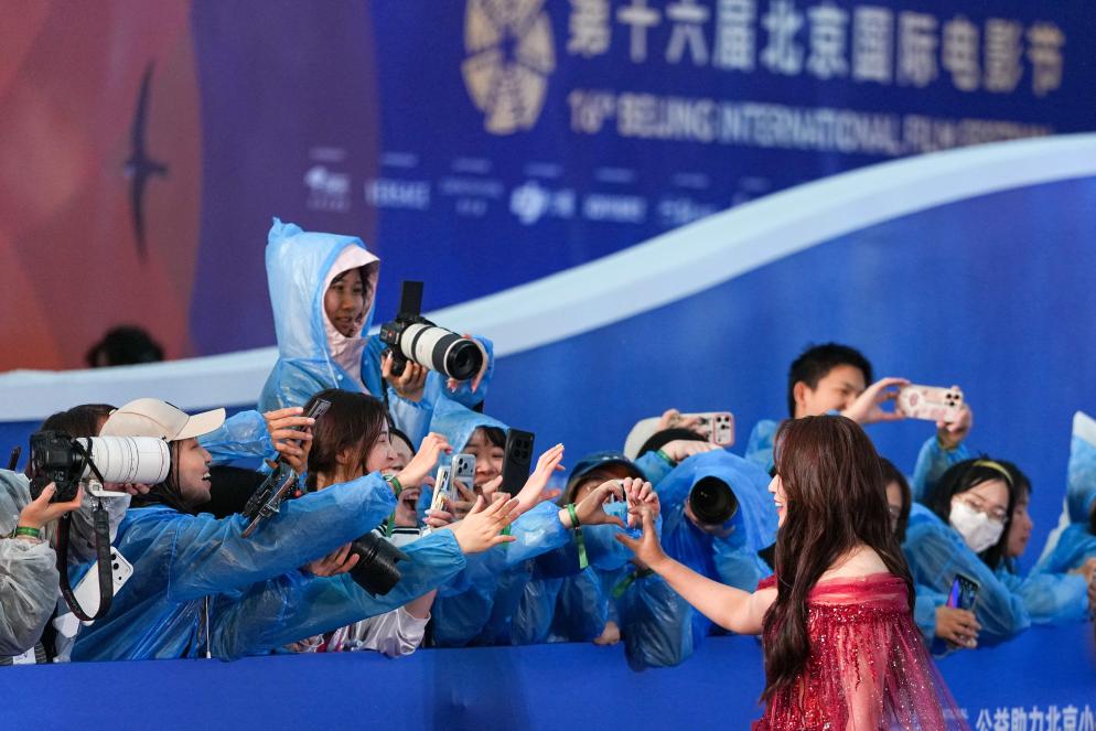 4月16日,演员江疏影在开幕红毯上与影迷互动。新华社记者 鞠焕宗 摄