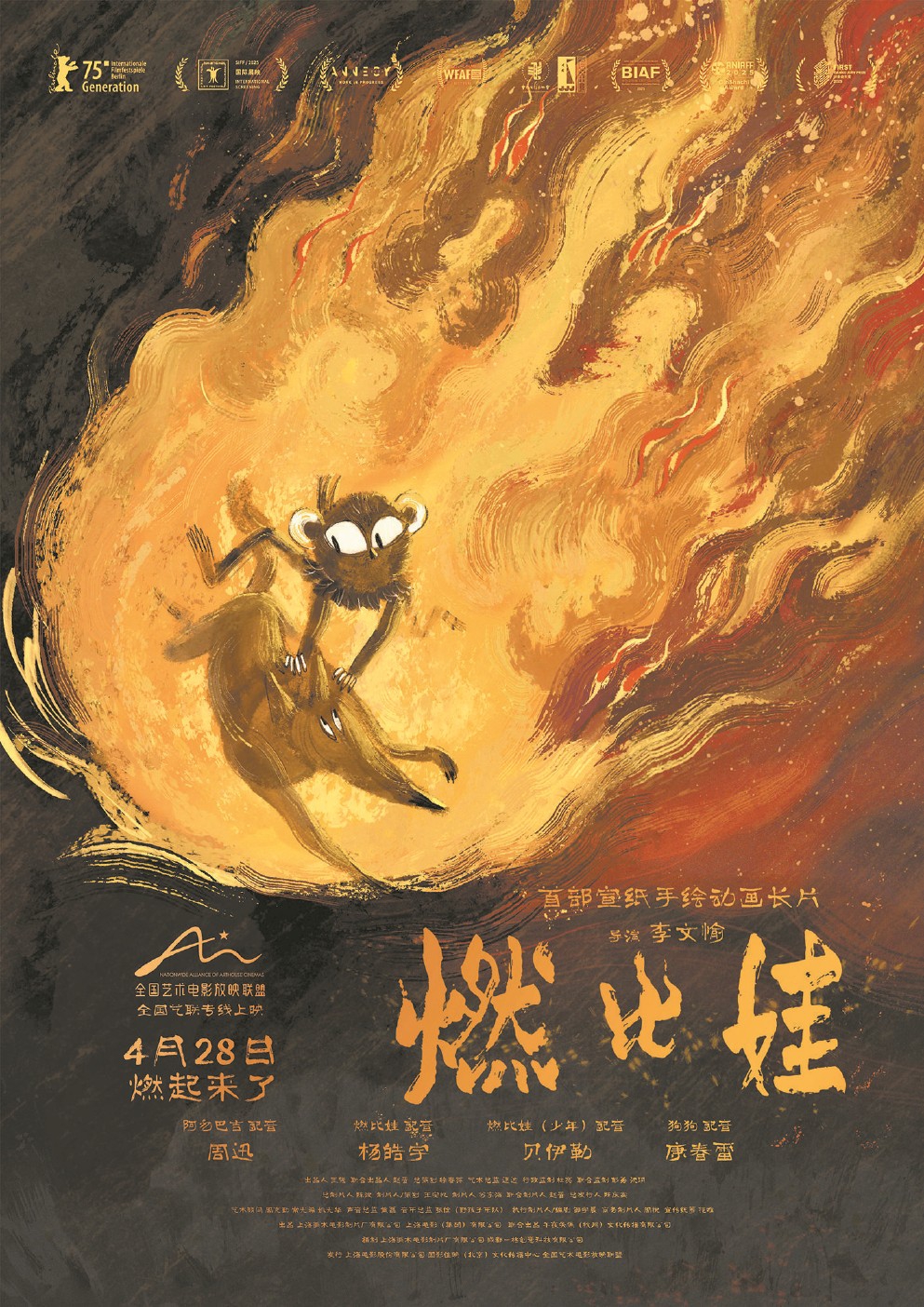 从《大闹天宫》的恢宏激昂到《山水情》的诗意留白,上美影用一笔一画勾勒出几代中国人的共同回忆。如今,中国动画学派又上新。作为首部宣纸手绘动画长片,《燃比娃》的故事扎根于古老的羌族神话,讲述了少年“燃比娃”与伙伴“狗狗”踏上艰险征途,前往神山探寻温暖真谛、夺取火种,最终揭开自身身世之谜的冒险历程。影片导演李文愉师从著名动画导演马克宣——后者正是经典水墨动画《山水情》的联合导演之一。李文愉介绍,影片全程采用宣纸手绘,累计创作画稿超五万张,“宣纸渗化、吸墨、留白带来的‘不可预期’,成就了影片的独特表达”。自从第75届柏林国际电影节全球首映以来,该片可谓一路累积影迷期待,曾获得海内外多项重磅荣誉,并入围三大国际A类电影节。