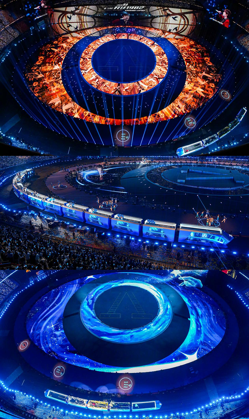 本次演唱会舞台命名为“斗转星移”,以前沿科技打造沉浸式观演体验。10000余平米主表演区、11000余平米环绕LED巨幕、2400平米悬浮屏与6900平米地屏构建震撼视觉体系,100余米巨型列车编组环绕12个“时间中转车站”,360°无盲区布局让每位观众都能拥有黄金视角。首次亮相的跳舞机器人更是亮点十足,在打碟环节融入“人机共生”隐喻,赛博朋克风格的科技感与温度兼具,展现出现代科技与艺术的完美融合。