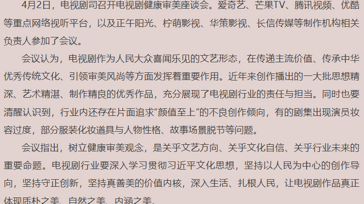 广电总局:电视剧创作要避免“颜值至上”“流量依赖”
