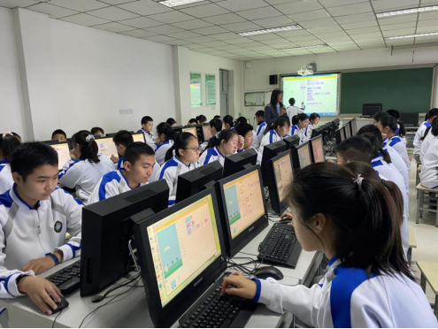 保定市三中分校同样是人工智能教育落地的示范学校,于2019年开始引入国产教育服务商“编程猫”进行信息技术课程教学。在校内教学上,三中分校采取普及教育与深入探索并重的教学方式,将信息技术课堂与社团活动结合起来。在信息技术课堂上,每一名学生都能学习到人工智能的基础知识,通过图形化编程工具创作作品,以此做到人工智能教育普及。同时在校内开设人工智能相关社团,利用课后时间,以学生兴趣为导向,更深入地探索有难度的问题。