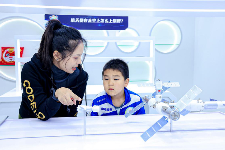 在展览现场,编程猫搭建了互动体验馆“编程猫太空研究所”,首次用少儿编程技术打造空间站互动体验模型,传达航天知识,吸引了大批家长和孩子驻足围观。