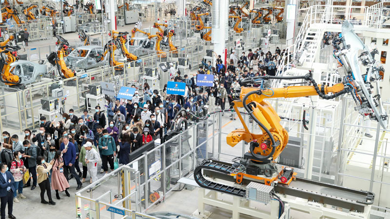 其中,冲压车间采用德国斯特曼全自动高速冲压线,并由日本发那科机器人组成自动装箱系统,实现生产、装箱和运输全自动化;车身车间采用德国库卡设备和技术,自动化率达100%,打造世界最先进的高端智能“黑灯工厂”;涂装车间采用德国杜尔生产线,前处理电泳翻转式输送,干式漆雾分离,涂胶、喷涂100%自动化,全流程智能环保。