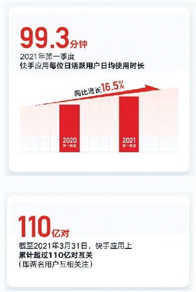 一季度,快手坚持公域扶持和私域沉淀的融合,有效增加优质内容创作者的曝光机会,进一步巩固了快手平台上的内容创作与内容消费良性循环,用户与内容创作者之间的社交信任也由此进一步加强。截至2021年3月31日,快手应用上有超过110亿对相互关注。