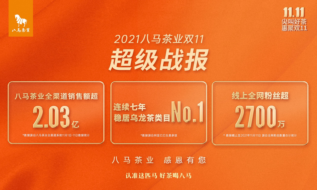11月12日,中国茶叶连锁领先品牌八马茶业公布了全渠道在双十一整体战报:双十一期间,八马茶业全渠道总销售额再次取得突破性增长,销售额超2.03亿元,同比增长近7成,并且连续7年稳居乌龙茶类目第一,多品类持续综合领先。