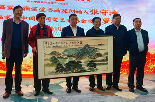 黄福水为活动支持单位海江集团赠送纪念标牌。著名书画家张守涛、罗杨向海江集团赠送国画《绿水青山图》。
