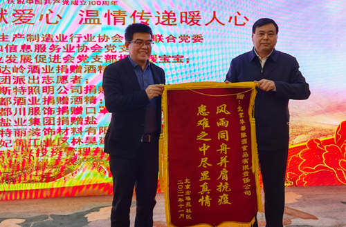 黄福水向疫情期间为宏福苑社区捐赠物资单位赠送致谢锦旗。
