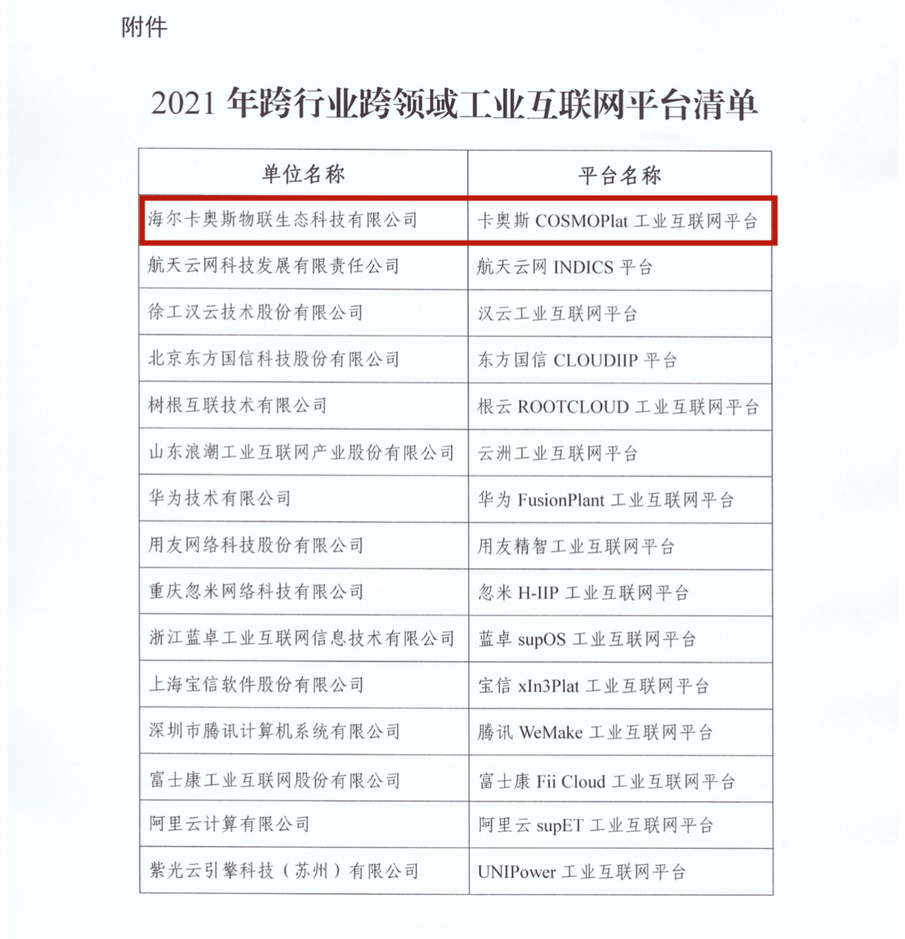 近日,工信部公布了2021年跨行业跨领域工业互联网平台清单,卡奥斯COSMOPlat工业互联网平台、航天云网INDICS平台、汉云工业互联网平台等15家平台入选,其中,卡奥斯COSMOPlat位居首位。