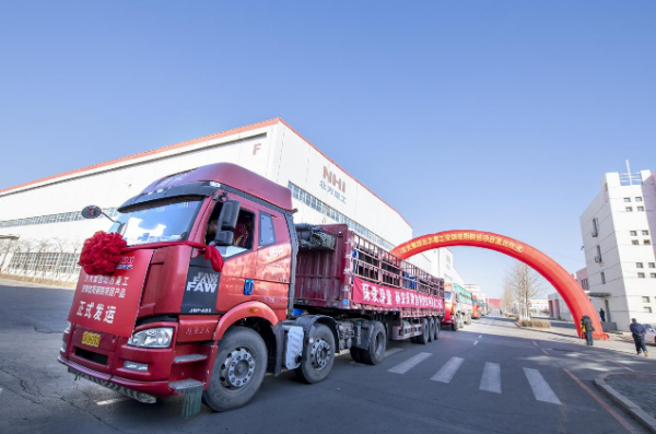2月7日,方大集团北方重工厂区内张灯结彩,一辆辆载满货物的卡车披挂红花、挂满条幅、整装待发,这是为安钢信阳钢铁生产的烧结、环冷产品。这些产品将从这里出发,运抵设备安装现场。