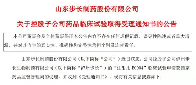 近日山东步长制药股份有限公司(以下简称“步长制药”) 发布关于控股子公司获得药品临床试验受理通知书的公告。公告显示其控股子公司四川泸州步长生物制药有限公司的“注射用 BC004”临床试验申请获国家药品监督管理局的受理,并收到《受理通知书》。