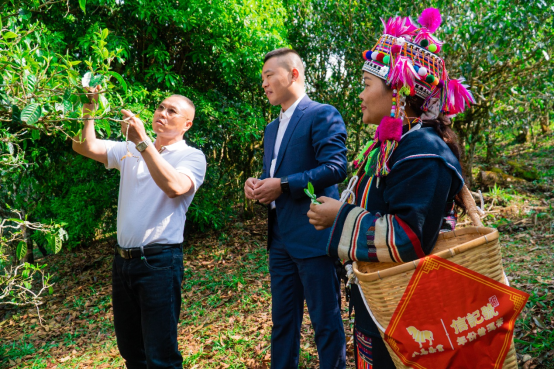 老班章茶王地采摘现场(左一为云南省农业科学院茶叶研究所所长何青元、中间为八马茶业董事、副总经理何磊,右一为老班章茶王茶后树守护人杨红花)