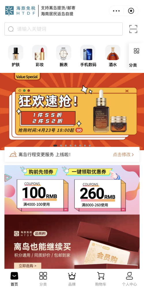 2021年6月,京东国际与三亚海旅免税城以京东小程序店的形式展开合作,上线了包括进口酒水、美妆、手机、香水等上万款尖货,服务海南离岛游客购买线上商城提供的免税商品,为时间不够充裕或习惯线上购物的消费者提供了极大便利。