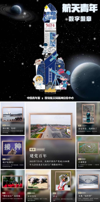 2021年12月,新华社通过旗下数字版权藏品平台推出中国首套“新闻数字藏品”,精选全年新闻摄影报道进行铸造;2022年6月初,国家航天局新闻宣传中心与中国青年报联合推出数字藏品“航天青年数字徽章”,致敬中国载人航天事业30年;不久前,中国探月工程以数字藏品的形式发行我国第一艘数字载人飞船“梦想号”,招募一万名“太空数字乘客”上太空……这些数字藏品无一例外上线即“秒光”,足见其受欢迎程度。