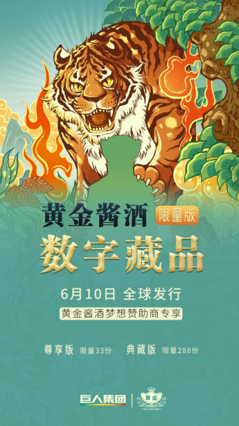 6月10日,巨人集团旗下白酒品牌黄金酱酒今日宣布推出首款限量数字藏品,一共发行33个尊享版、288个典藏版。其中,编号1的尊享版数字藏品由巨人集团创始人史玉柱持有,著名歌唱家、黄金酱酒首席情绪官腾格尔持有编号8的尊享版数字藏品,中国酒业协会副理事长、江南大学副校长徐岩也是首批持有者。
