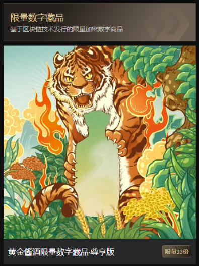 此次黄金酱酒发行的限量数字藏品,既是运用当代艺术语言对传统白酒文化的创新诠释,亦是以数字化技术弘扬白酒文化的一次探索与尝试。在创作上以今年虎年为契机,该数字藏品有机融合了中国生肖文化与千年白酒文化,以“百兽之王”老虎的国风形象与白酒酿造元素为创作主题,绘就了一幅虎啸风生、酒香旖旎的景象,插上了数字化技术“翅膀”的白酒文化展现出其独有魅力。