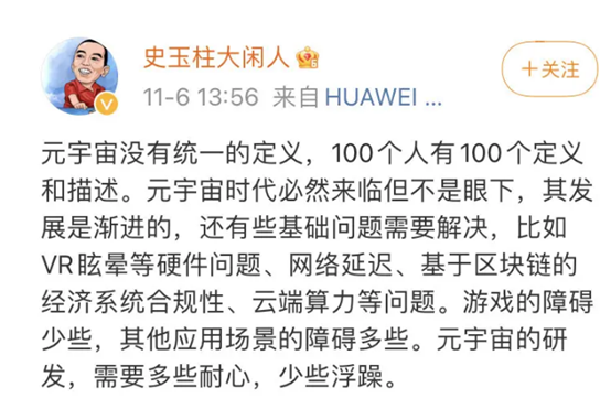 众所周知,史玉柱一直看好元宇宙的发展方向,他曾在社交媒体发表了对元宇宙的观点,他认为元宇宙没有统一的定义,100个人有100个定义和描述,元宇宙时代必然来临。