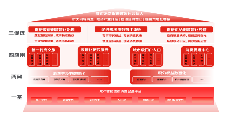 该平台构建了“一基、两翼、四应用、三促进”的服务体系。据京东科技数字城市群副总裁蒋凡介绍,“一基”指搭建智能城市消费促进平台,以消费服务为核心,以消费券、会员、权益、积分、营销体系为抓手,连接线下食、宿、行、游、购、娱业态商家,实现市民消费的有效触达,打造本地化城市消费数字底座,促进线上线下融合发展。“两翼”指消费券/节数智化解决方案和积分权益数智化解决方案;“四应用”指面向商文旅、便民服务、城市级门户入口及消费促进中心场景提供数智化综合解决方案;“三促进”指通过“一基、两翼、四应用”的支撑,平台可充分激活并促进政府侧数智化治理提升、促进需求侧数智化体验提升、促进供给侧数智化经营提升。